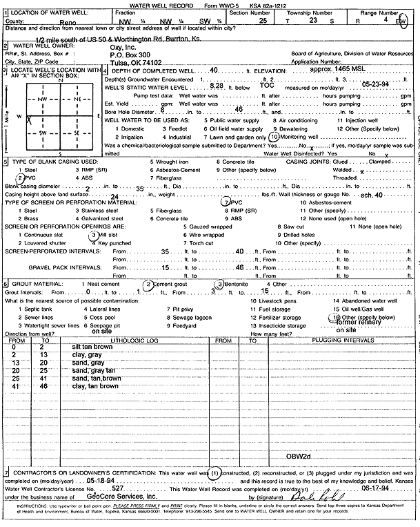 Oxy USA, Inc. | 40 ft. | 8.28 ft. | Monitoring well/observation/piezometer | OBW 2D | Constructed | 18-May-1994 | Scan | |