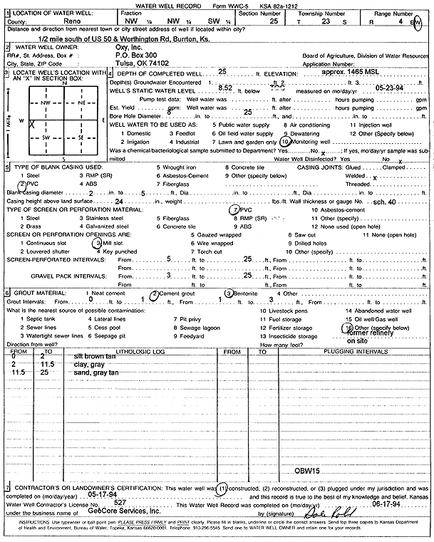Oxy USA, Inc. | 25 ft. | 4.38 ft. | Monitoring well/observation/piezometer | MW 12 | Constructed | 18-May-1994 | Scan | |