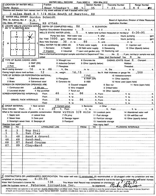 Schmidt, Gordon | 86 ft. | 5 ft. | 1000 gpm. | Irrigation | Constructed | 30-Jun-1995 | Scan | |