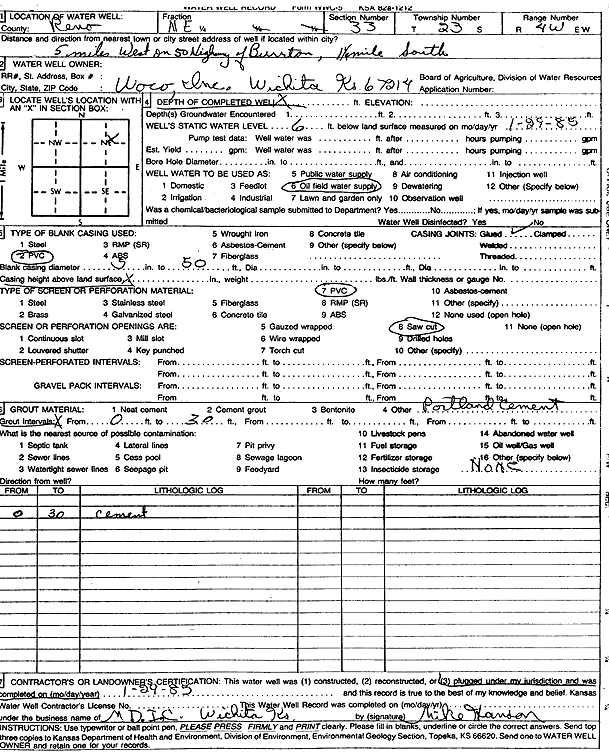Woco, Inc. | 30 ft. | 6 ft. | Oil Field Water Supply | Plugged | 29-Jan-1985 | Scan | ||