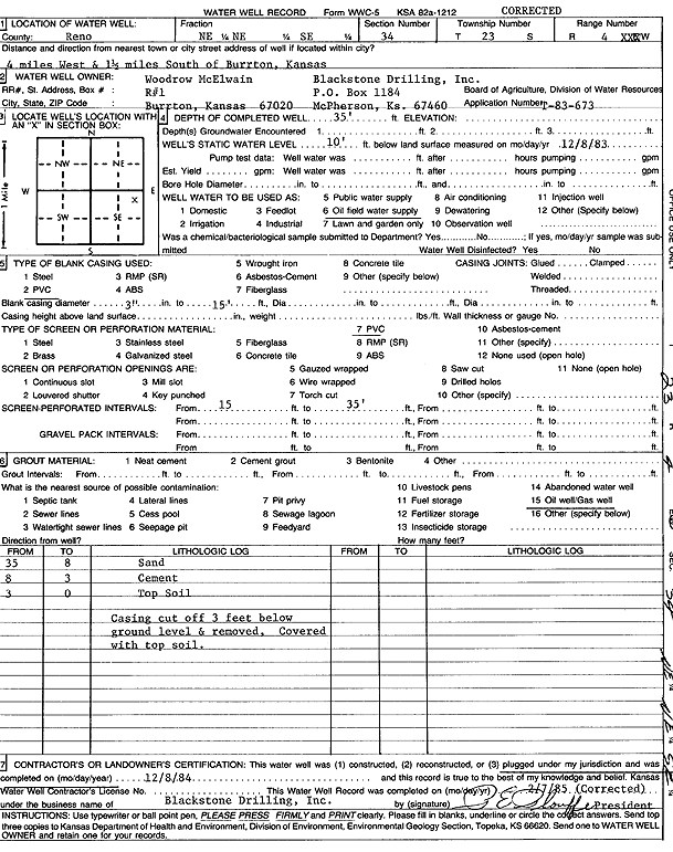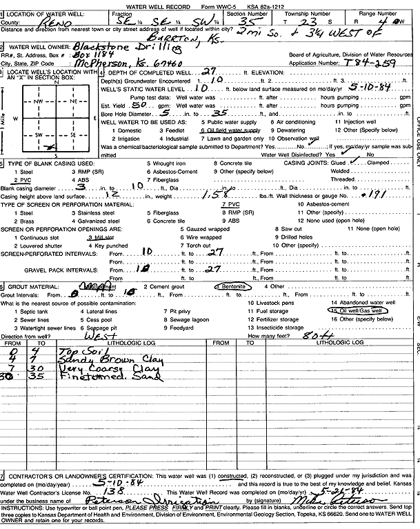 Blackstone Drilling/Woodrow McElwain | 35 ft. | 10 ft. | Oil Field Water Supply | Plugged | 08-Dec-1984 | Scan | ||