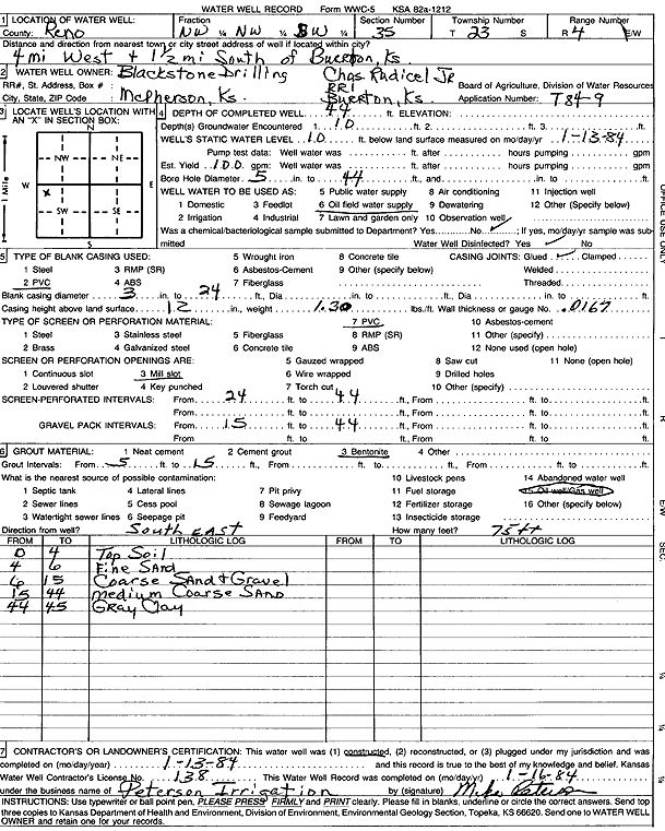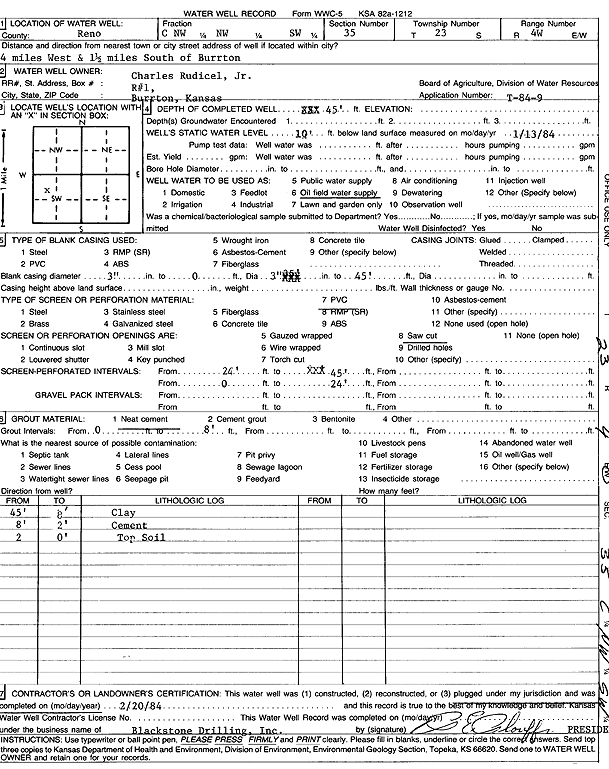 Blackstone Drilling/Charles Rudicel Jr. | 44 ft. | 10 ft. | 100 gpm. | Oil Field Water Supply | Constructed | 13-Jan-1984 | Scan | |