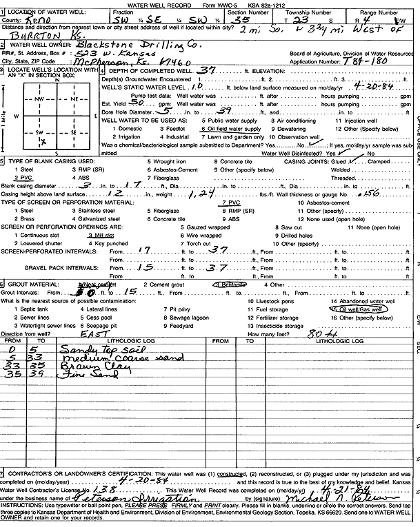 Blackstone Drilling Co. | 37 ft. | 10 ft. | 50 gpm. | Oil Field Water Supply | Constructed | 20-Apr-1984 | Scan | |