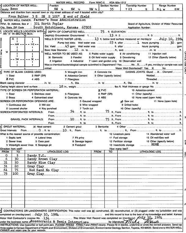Farmer's Home Administration | 75 ft. | 13 ft. | 45 gpm. | Domestic | Constructed | 10-Jul-1984 | Scan | |