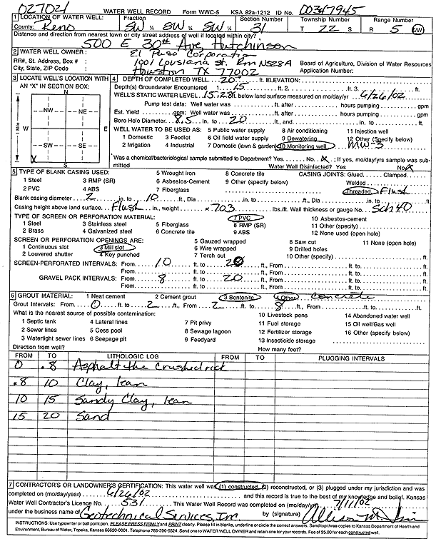 El Paso Corp. | 20 ft. | 14.95 ft. | Monitoring well/observation/piezometer | MW 2 | Constructed | 26-Jun-2002 | Scan | |
