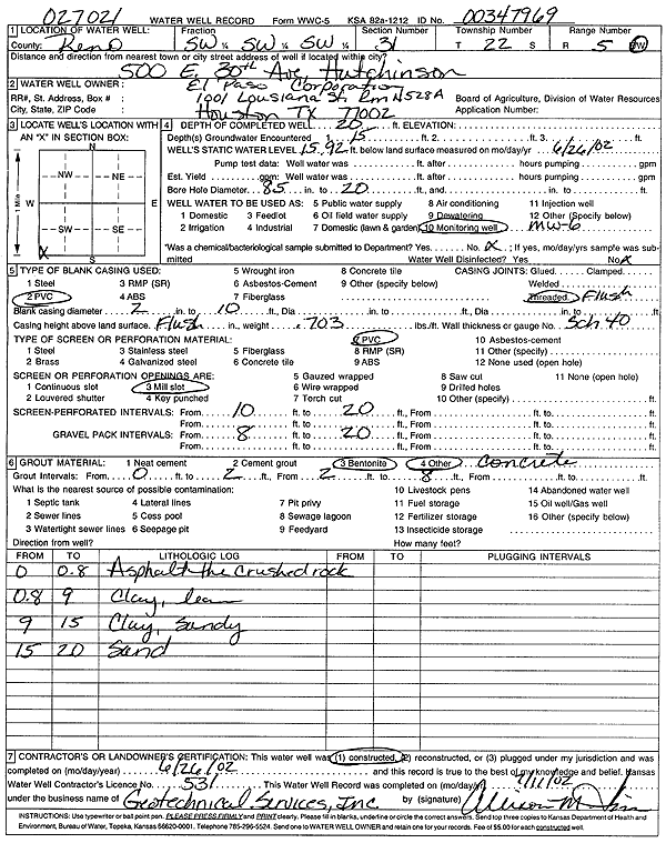 El Paso Corp. | 20 ft. | 15.92 ft. | Monitoring well/observation/piezometer | MW 6 | Constructed | 26-Jun-2002 | Scan | |