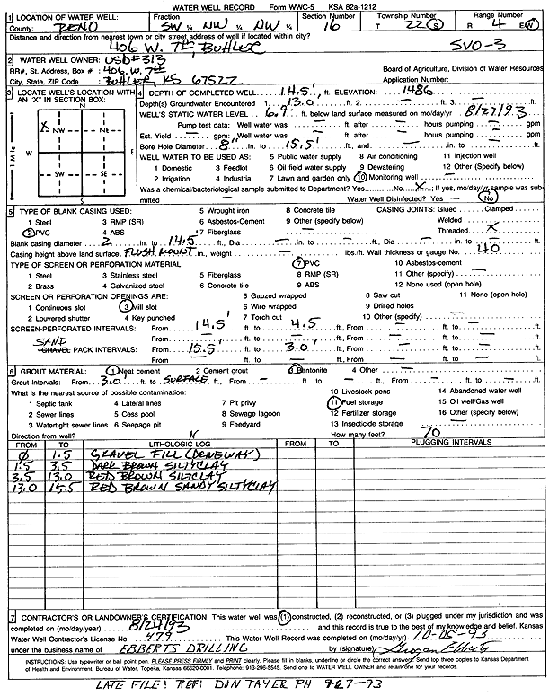 USD 313 | 15.12 ft. | 8.3 ft. | Monitoring well/observation/piezometer | MW 25 | Constructed | 24-Aug-1993 | Scan | |
