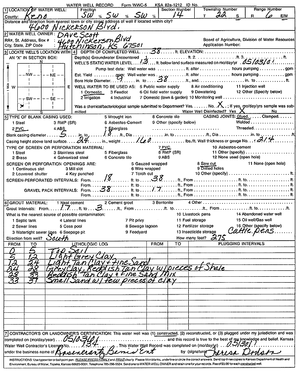 City of Hutchinson | 60 ft. | 11 ft. | 2000 gpm. | Public Water Supply | Constructed | 20-Jan-1993 | Scan | |
