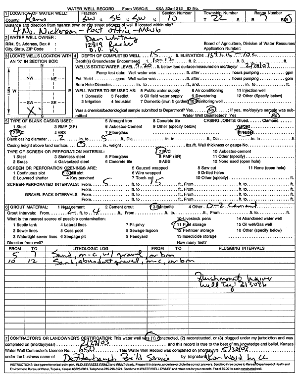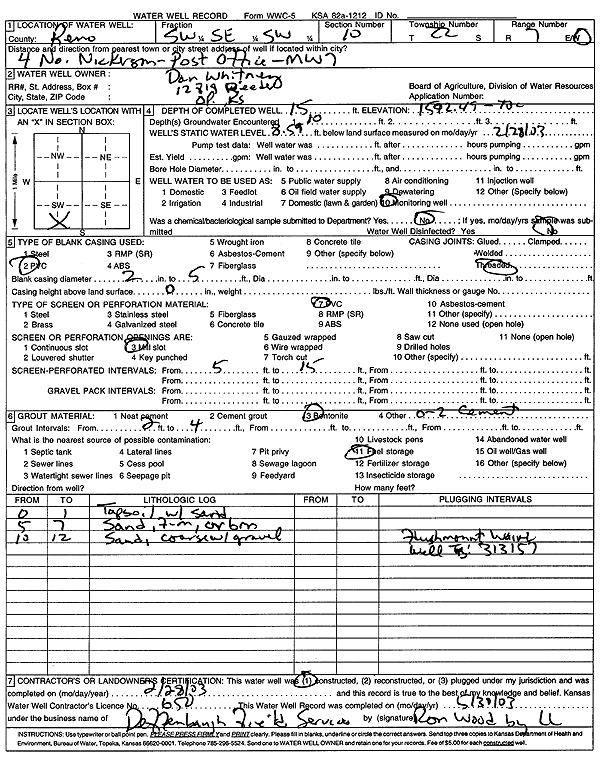 Whitney, Dan | 15 ft. | 8.59 ft. | Monitoring well/observation/piezometer | MW 7 | Constructed | 28-Feb-2003 | Scan | |