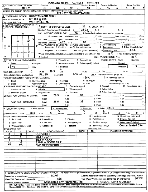 Coastal Mart 9131 | 32 ft. | Environmental Remediation, Air Sparge | AS 5 | Constructed | 02-May-2001 | Scan | ||