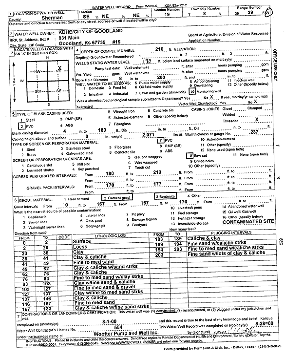 KDHE/City of Goodland | 210 ft. | Monitoring well/observation/piezometer | MW 23 | Constructed | 01-Aug-2000 | Scan | ||
