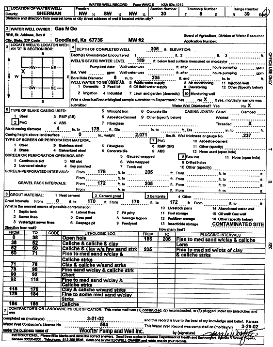 Gas N Go | 205 ft. | 189 ft. | Monitoring well/observation/piezometer | MW 2 | Constructed | 21-Mar-2002 | Scan | |