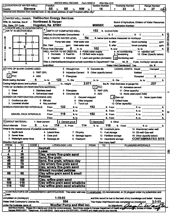 Halliburton Energy Services | 152 ft. | Monitoring well/observation/piezometer | MW 06R | Constructed | 10-Jan-2003 | Scan | ||
