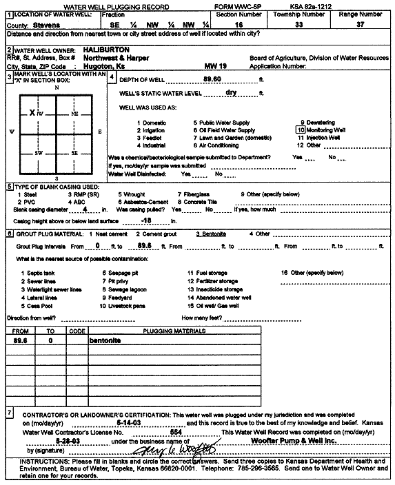 Halliburton Energy Services | 89.6 ft. | Monitoring well/observation/piezometer | MW 19 | Plugged | 14-May-2003 | Scan | ||