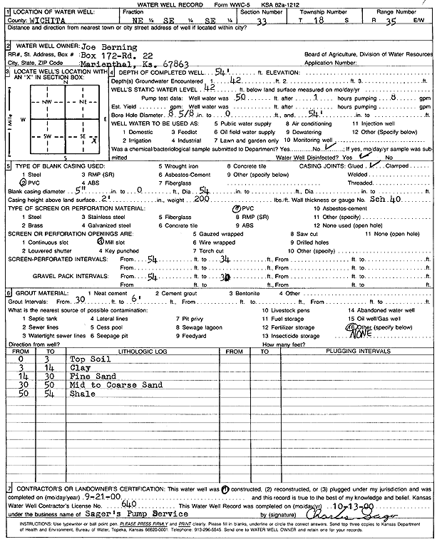 Berning, Joe | 50 ft. | 40 ft. | 8 gpm. | Domestic | Constructed | 11-Jun-1993 | ||