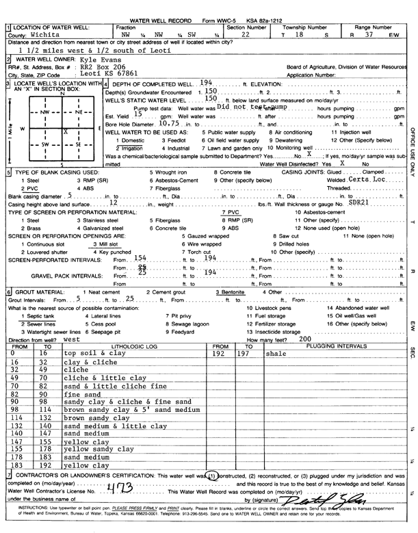 Evans, Kyle | 194 ft. | 150 ft. | 15 gpm. | Domestic | Constructed | Scan | ||