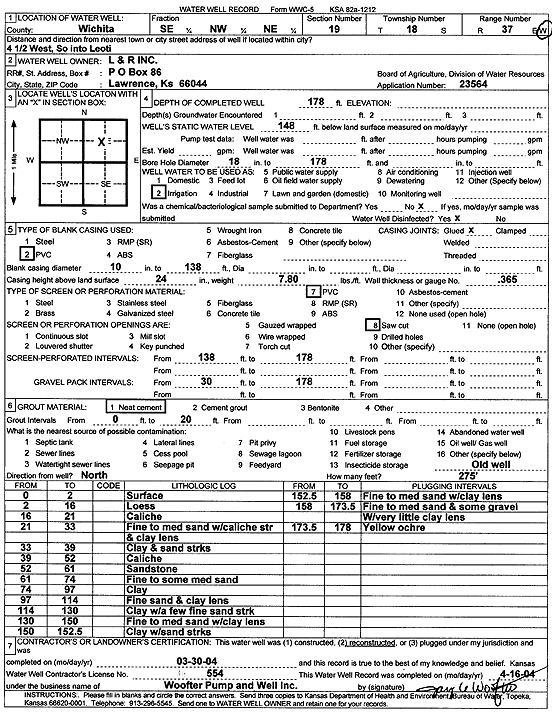City of Leoti | 172 ft. | 117 ft. | 260 gpm. | Public Water Supply | Well 9 | Constructed | 05-Apr-1977 | |