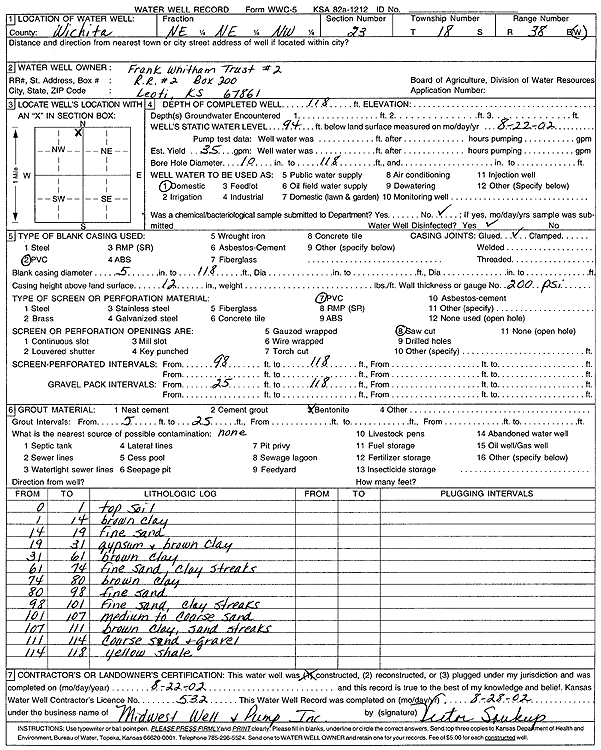 Frank E. Whitham Trust No. 2 | 118 ft. | 94 ft. | 35 gpm. | Domestic | Constructed | 22-Aug-2002 | Scan | |