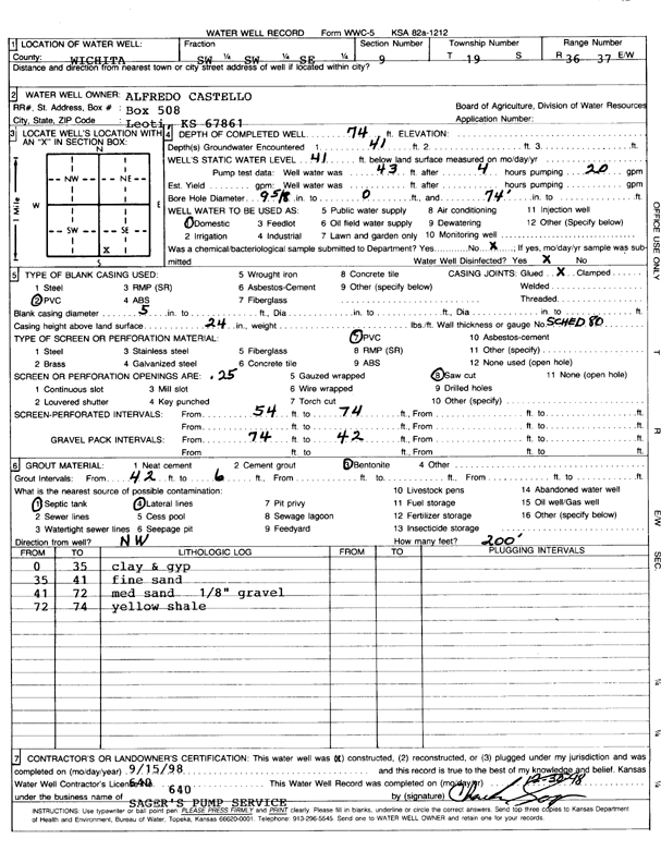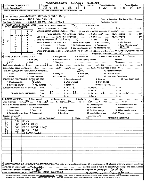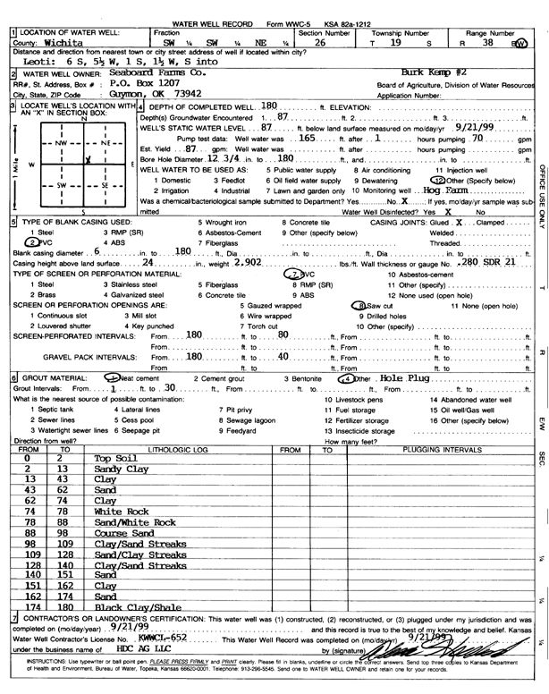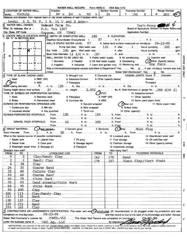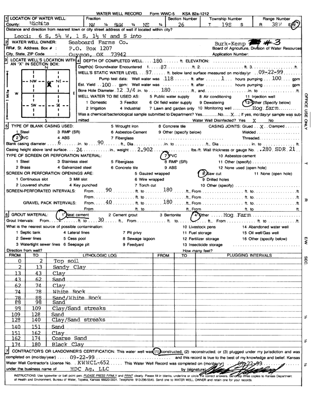 Seaboard Farms Co. | 180 ft. | 87 ft. | 87 gpm. | Feedlot | Burk-Kemp 2 | Constructed | 21-Sep-1999 | Scan |