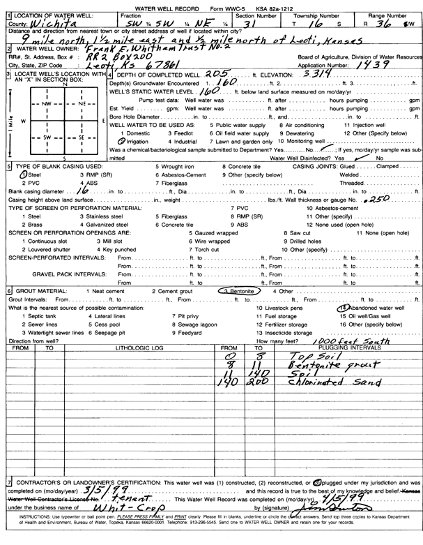 Frank E. Whitham Trust No. 2 | 205 ft. | 160 ft. | Irrigation | Plugged | 05-Mar-1999 | Scan | ||