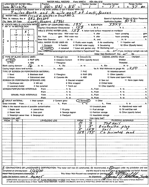 Frank E. Whitham Trust No. 2 | 195 ft. | 158 ft. | Irrigation | Plugged | 26-Jan-2000 | Scan | ||