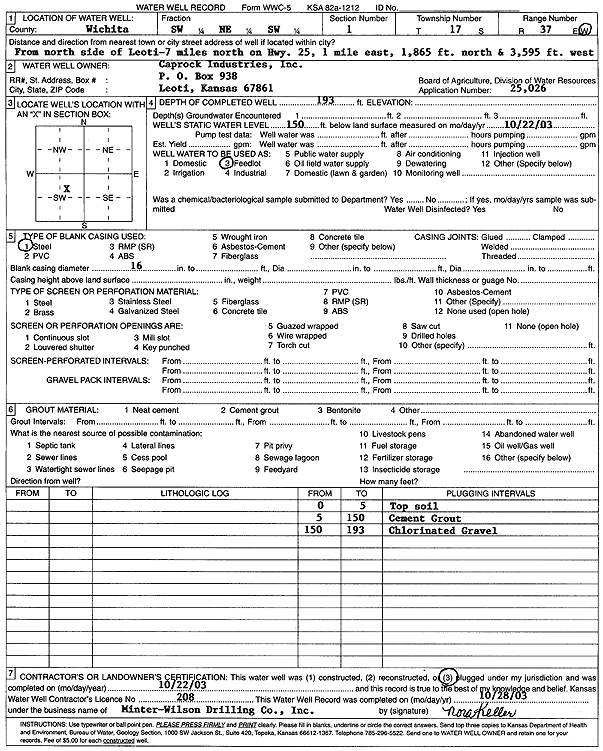 Caprock Industries, Inc. | 193 ft. | 150 ft. | Feedlot | Plugged | 22-Oct-2003 | Scan | ||