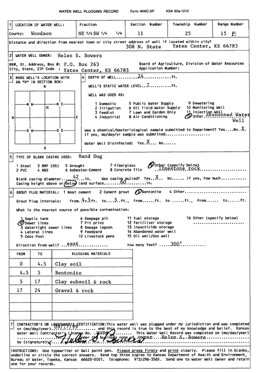 Bowers, Helen S | 24 ft. | 7 ft. | (unstated)/abandoned | Plugged | 17-Sep-1999 | Scan | ||