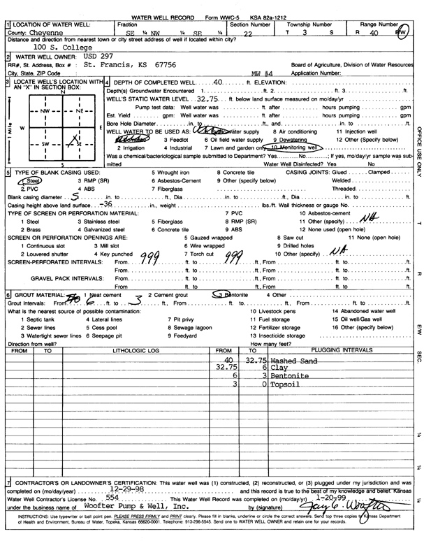 USD 297 | 40 ft. | 32.75 ft. | Monitoring well/observation/piezometer | MW 4 | Plugged | 29-Dec-1998 | Scan | |