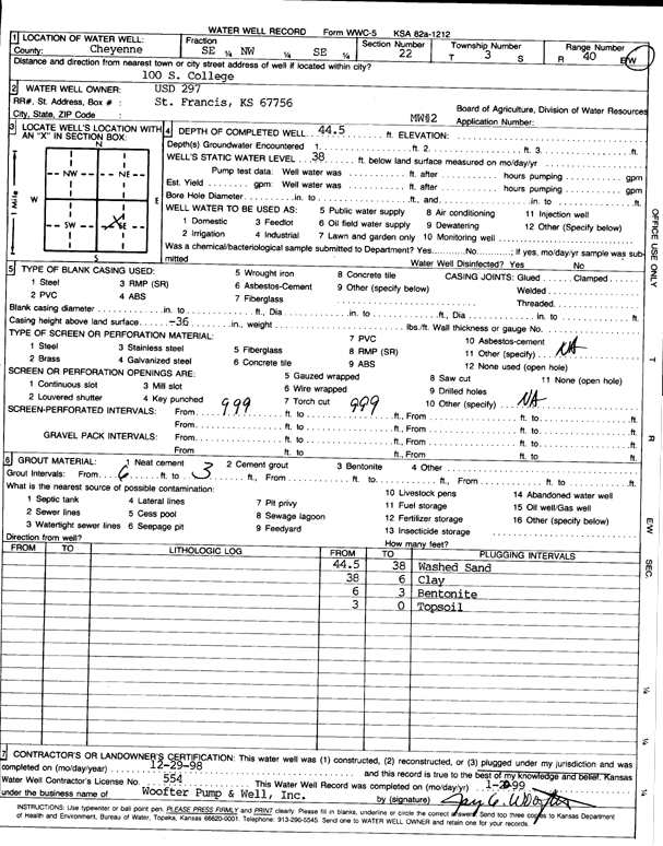 USD 297 | 44.5 ft. | 38 ft. | Monitoring well/observation/piezometer | MW 2 | Plugged | 29-Dec-1998 | Scan | |