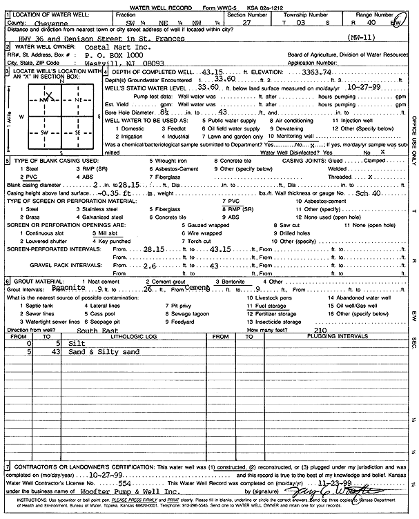 Coastal Mart Inc. | 43 ft. | 33 ft. | Monitoring well/observation/piezometer | MW 11 | Constructed | 27-Oct-1999 | Scan | |