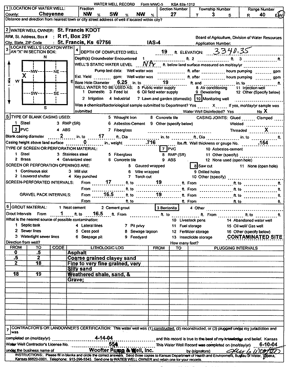 St Francis KDOT | 15 ft. | 11.73 ft. | Monitoring well/observation/piezometer | SVE 3 | Constructed | 13-Apr-2004 | Scan | |