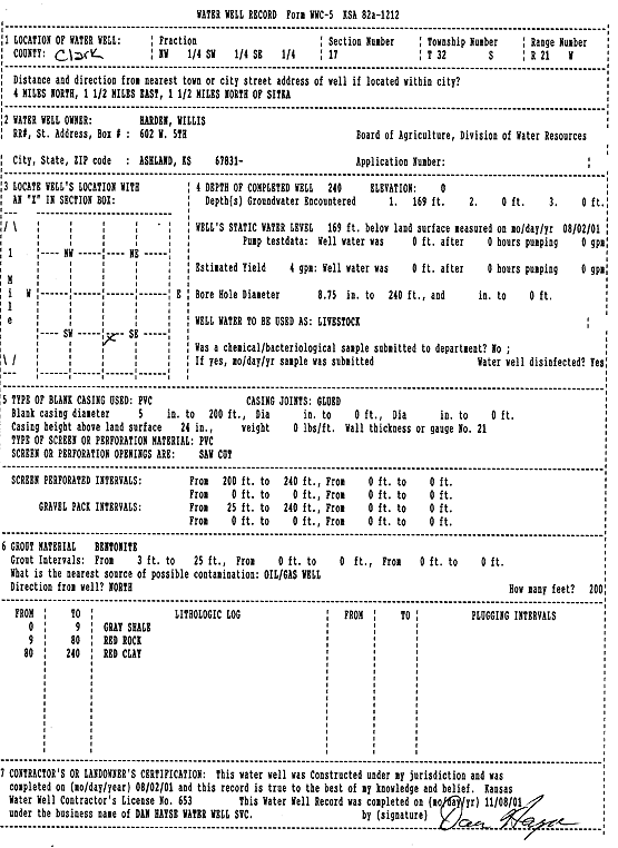 Harden, Willis | 240 ft. | 169 ft. | 4 gpm. | Domestic, Livestock | Constructed | 02-Aug-2001 | Scan | |