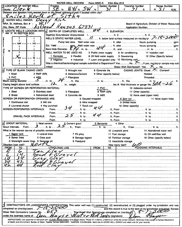 Davis, Ken | 100 ft. | 26 ft. | 20 gpm. | Domestic, Livestock | Constructed | 21-Sep-2012 |