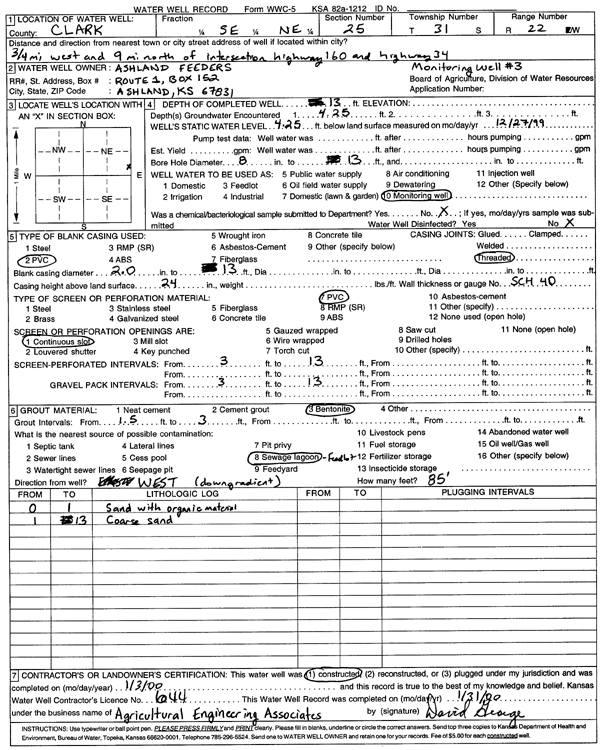 Ashland Feeders | 13 ft. | 4.25 ft. | Monitoring well/observation/piezometer | MW 3 | Constructed | 13-Jan-2000 | Scan | |