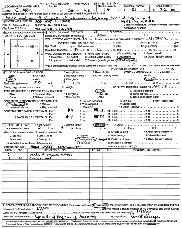 Ashland Feeders | 13 ft. | 3.42 ft. | Monitoring well/observation/piezometer | MW 4 | Constructed | 03-Jan-2000 | Scan | |