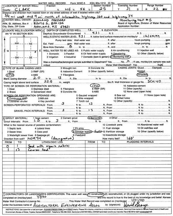 Ashland Feeders | 13 ft. | 4.31 ft. | Monitoring well/observation/piezometer | MW 5 | Constructed | 03-Jan-2000 | Scan | |