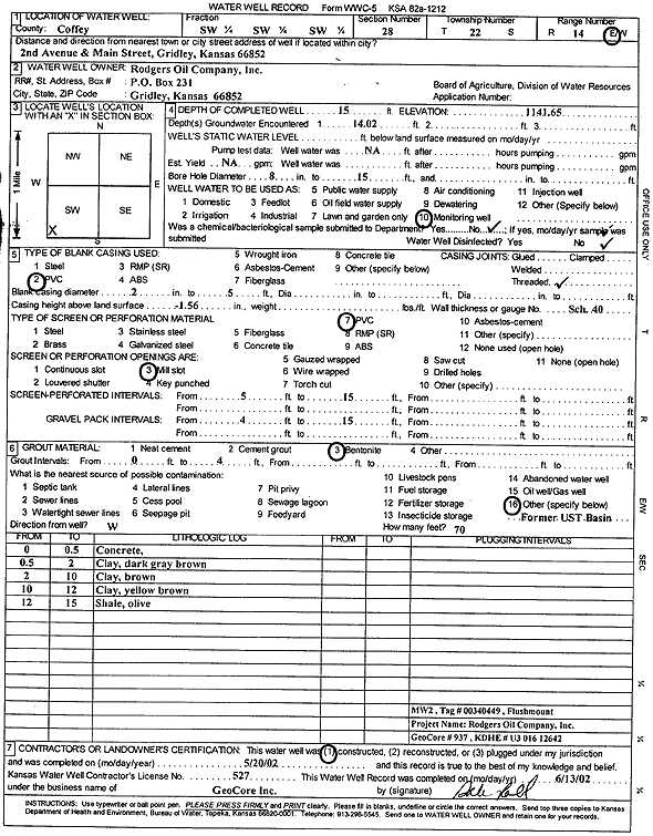 Rodgers Oil Co., Inc. | 15 ft. | Monitoring well/observation/piezometer | MW 2 | Constructed | 20-May-2002 | Scan | ||
