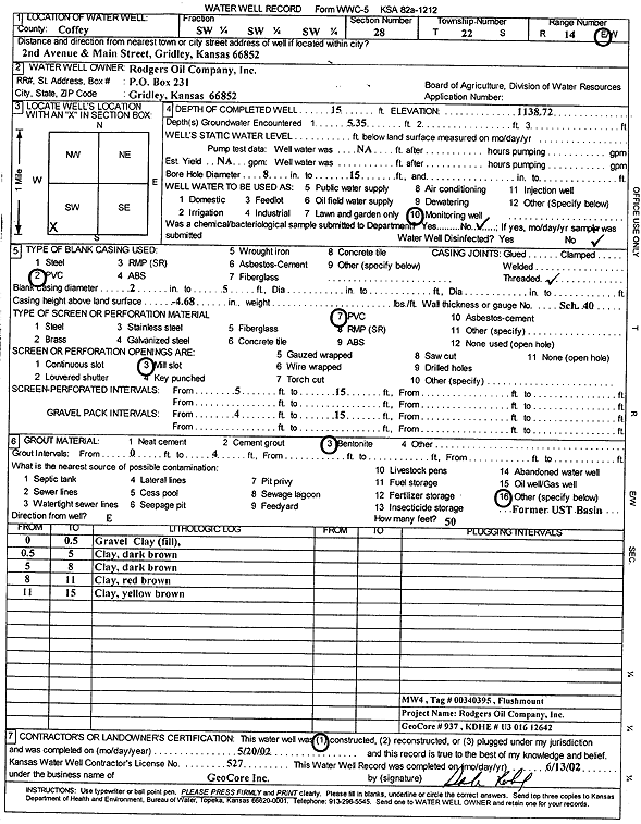 Rodgers Oil Co., Inc. | 13.75 ft. | Monitoring well/observation/piezometer | MW 5 | Constructed | 21-May-2002 | Scan | ||