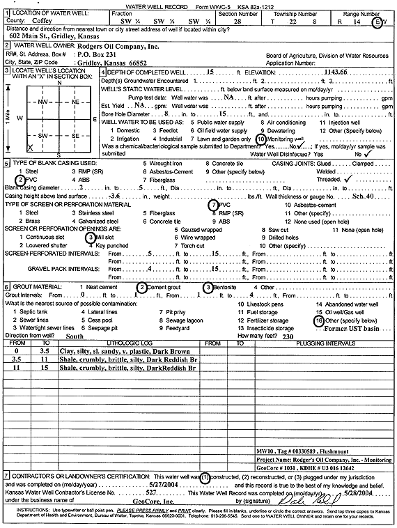 Rodgers Oil Co., Inc. | 15 ft. | Monitoring well/observation/piezometer | MW 10 | Constructed | 27-May-2004 | Scan | ||