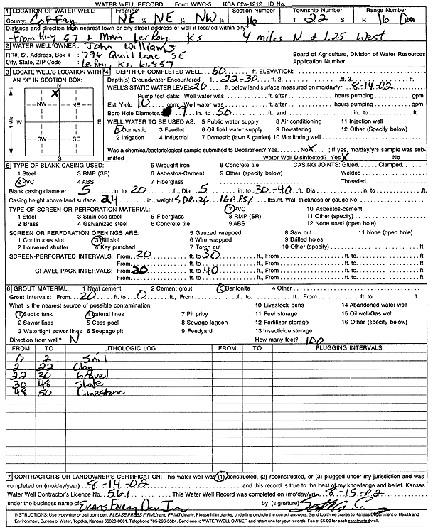 Williams, John | 50 ft. | 20 ft. | 10 gpm. | Domestic | Constructed | 14-Aug-2002 | Scan | |