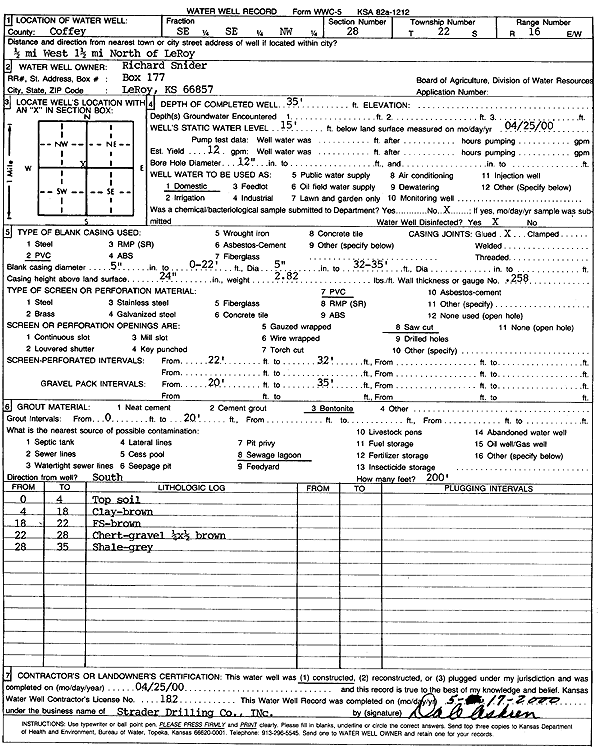 Snider, Richard | 35 ft. | 15 ft. | 12 gpm. | Domestic | Constructed | 25-Apr-2000 | Scan | |