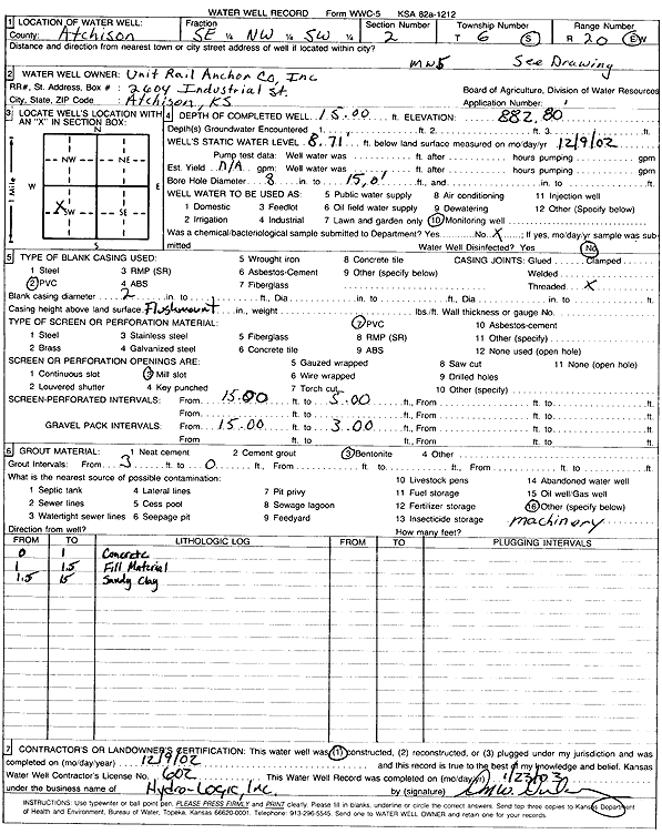 Unit Rail Anchor | 15 ft. | 8.71 ft. | Monitoring well/observation/piezometer | MW 5 | Constructed | 09-Dec-2002 | Scan | |