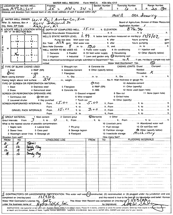 Unit Rail Anchor | 15 ft. | 1.49 ft. | Monitoring well/observation/piezometer | MW 11 | Constructed | 09-Dec-2002 | Scan | |