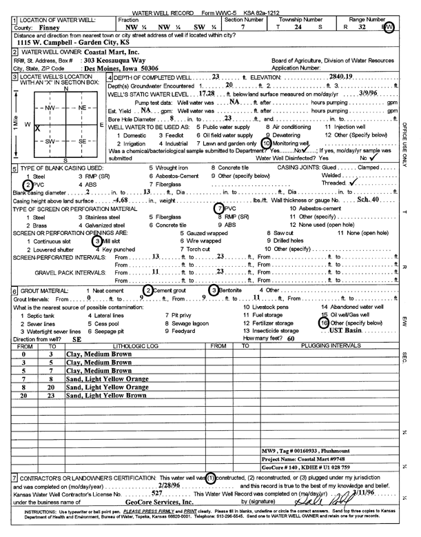 Coastal Mart, Inc. | 23 ft. | 17.28 ft. | Monitoring well/observation/piezometer | MW 9 | Constructed | 28-Feb-1996 | Scan | |