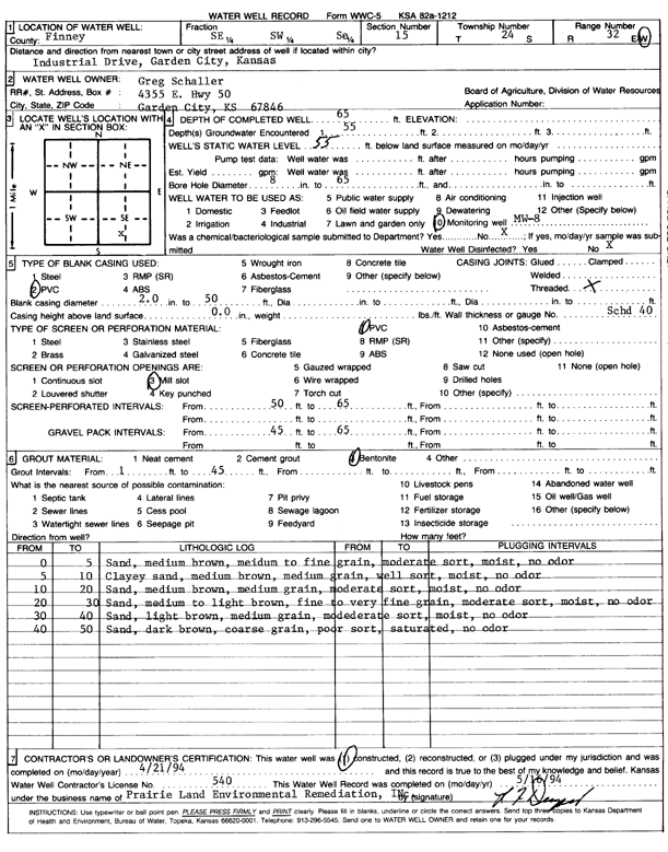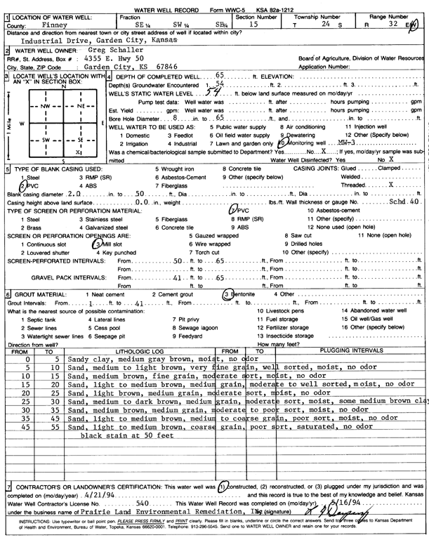 Schaller, Greg | 65 ft. | 57 ft. | Monitoring well/observation/piezometer | MW 1 | Constructed | 21-Apr-1994 | Scan | |