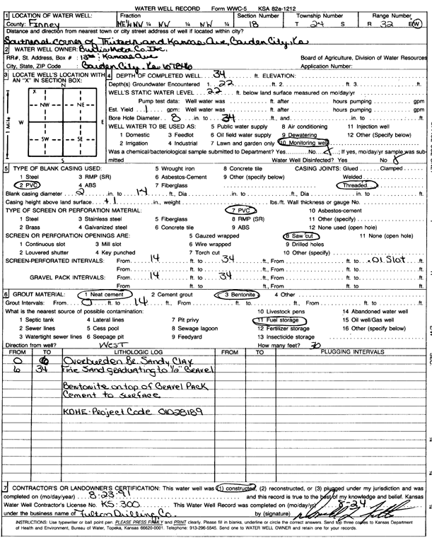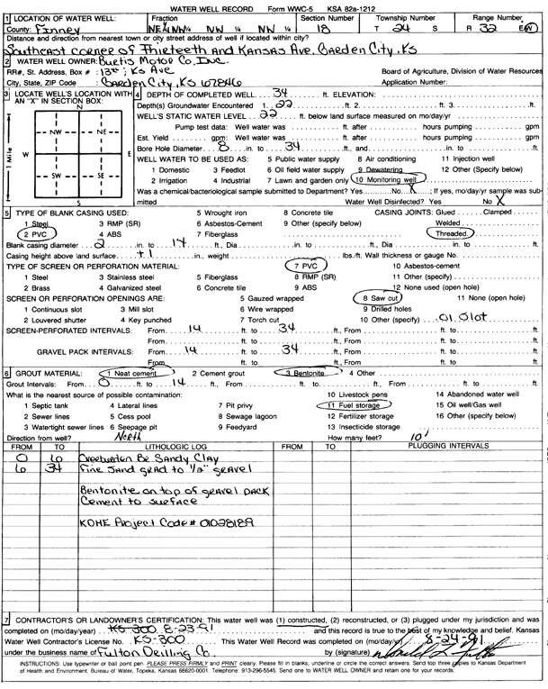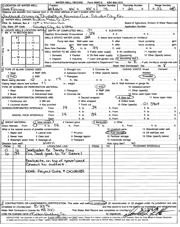 Burtis Motor Co. | 34 ft. | 22 ft. | 1 gpm. | Monitoring well/observation/piezometer | Constructed | 23-Aug-1991 | Scan | |