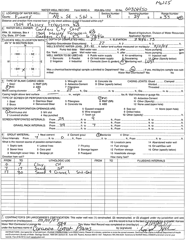 Garden City Coop, Inc. | 29 ft. | 22.41 ft. | Monitoring well/observation/piezometer | MW 25 | Constructed | 04-Feb-2004 | Scan | |