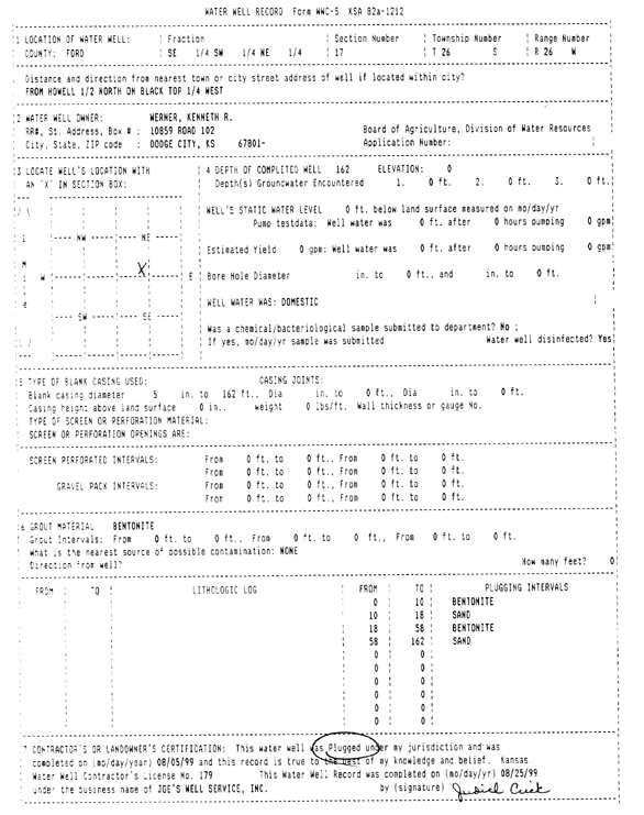 Werner, Kenneth R. | 162 ft. | Domestic | Plugged | 05-Aug-1999 | Scan | |||