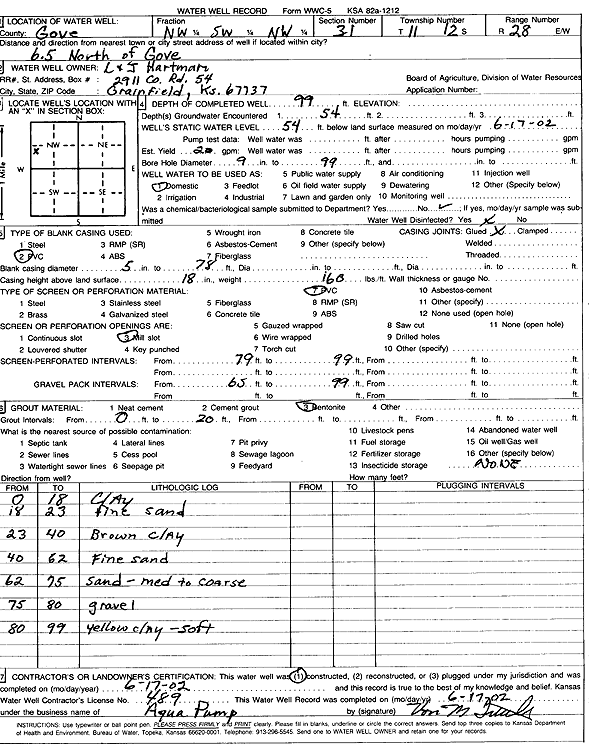 Gove County | 96 ft. | 87 ft. | 10 gpm. | Monitoring well/observation/piezometer | Constructed | 02-Mar-1994 | ||