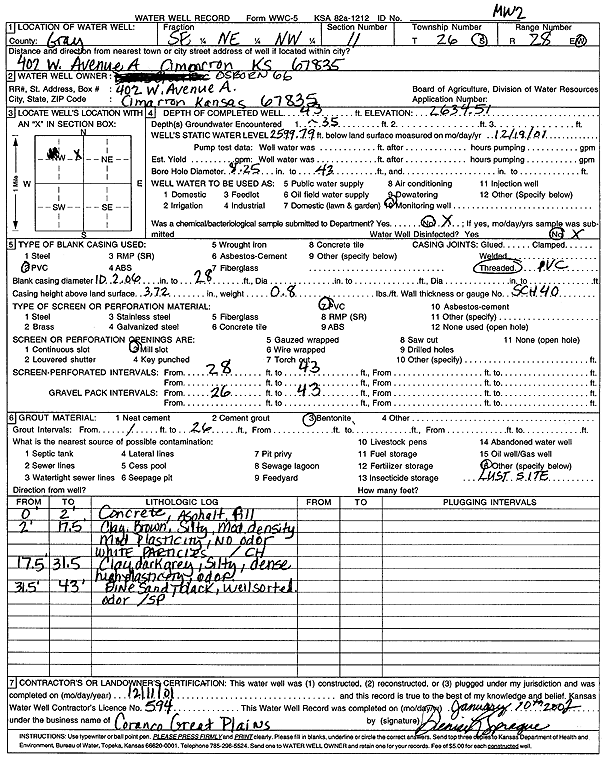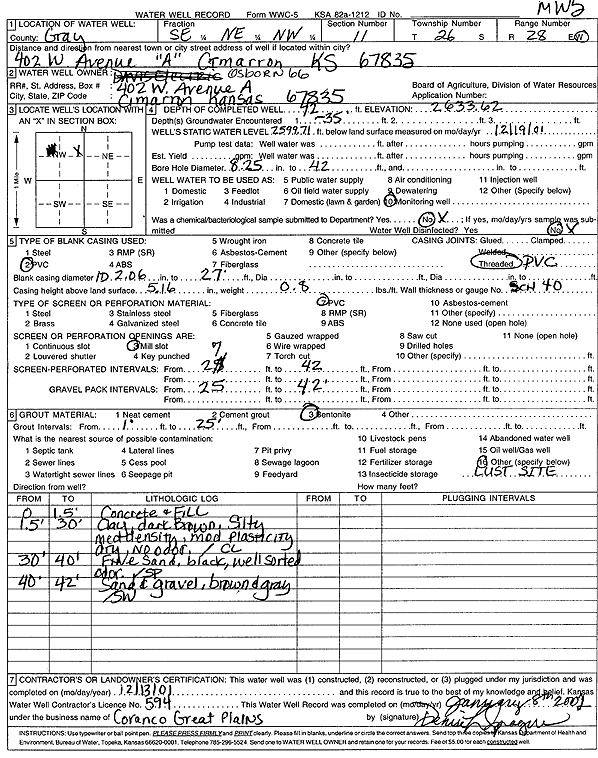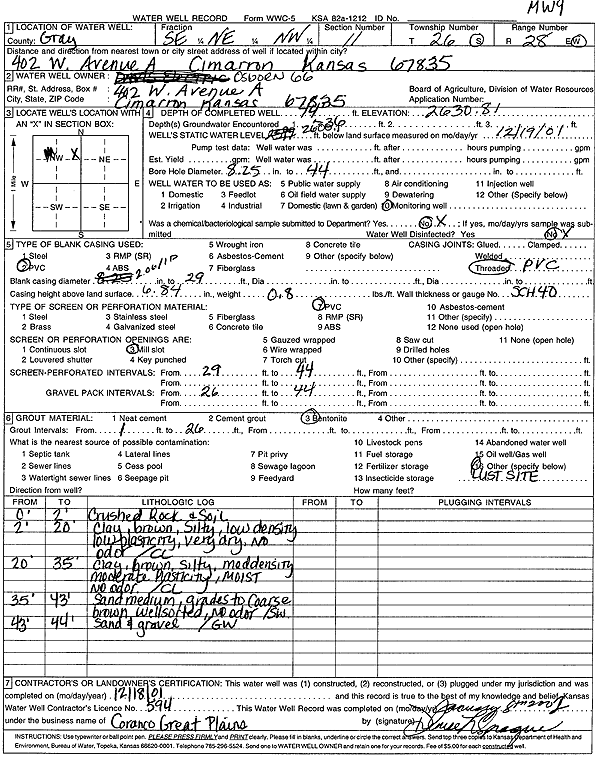 Osborn 66 | 42 ft. | 33.91 ft. | Monitoring well/observation/piezometer | MW 5 | Constructed | 13-Dec-2001 | Scan | |